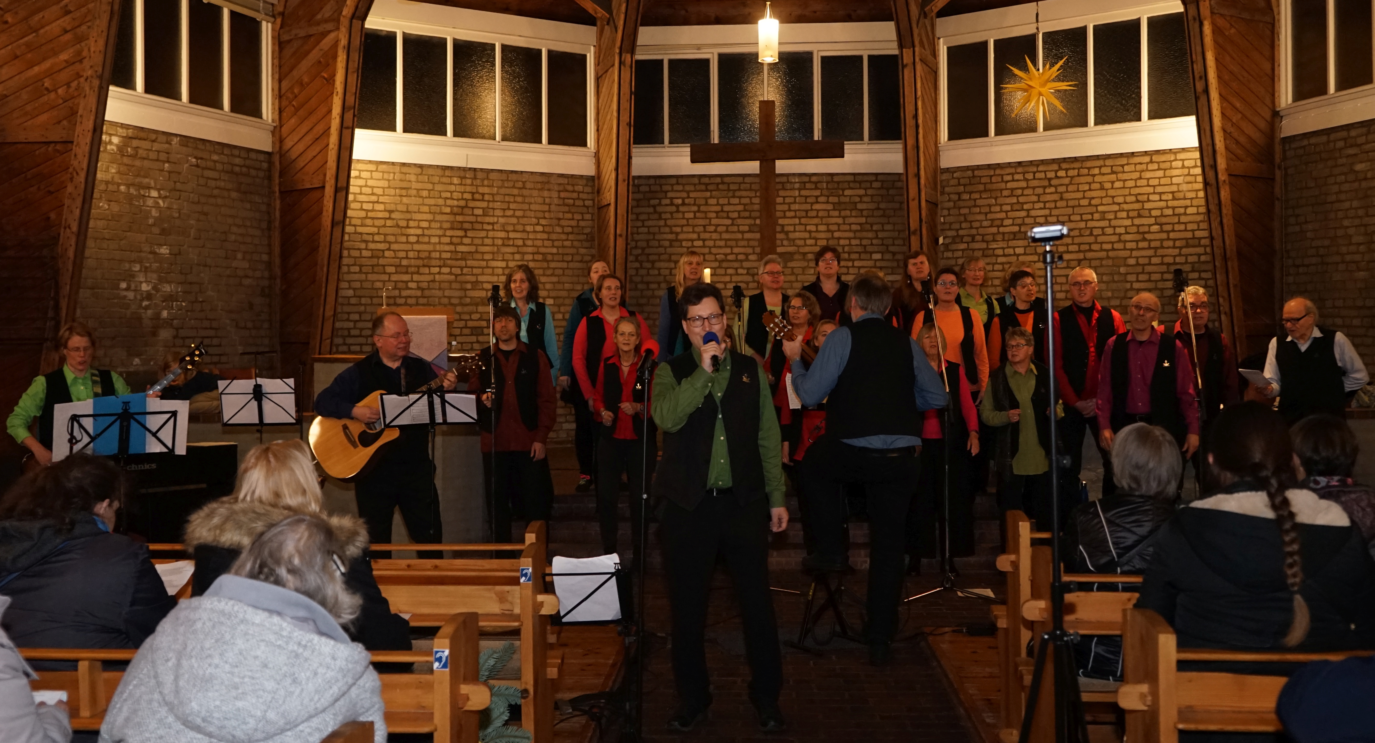 Nach einer zehnminütigen Pause starten wir. „Pastor Uwe“ begrüßt das Publikum und uns, bevor wir unser erstes Stück Michael row the boat ashore singen. Nach Ende desselben trifft unsere Cajónspielerin und zweite Pianistin ein, die noch beim Soundcheck für die A-Cappella-Party anwesend sein musste. Sie setzt sich auch direkt ans Klavier. Jetzt begrüßt unsere Vorsitzende Gloria das Publikum und erzählt u.a., dass dieses Konzert das einzige sei, in dem wir Weihnachtslieder singen. Sie kündigt die nächsten beiden Lieder an, nämlich The christmas way und Mary, did you know. Beide sind getragene Stücke.